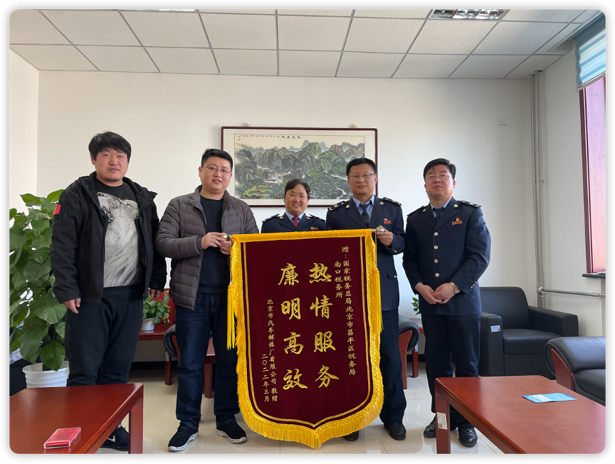 2022年3月7日,北京市汽車解體廠將一面印有“熱情服務,廉明高效”的錦旗送到昌平區(qū)稅務局南口稅務所。對南口稅務所一直以來對我企業(yè)熱情周到、廉明高效的服務,我企...