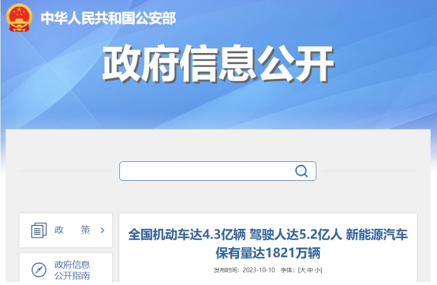 公安部:截至2023年9月底全國機(jī)動(dòng)車達(dá)4.3億輛新能源汽車保有量達(dá)1821萬輛