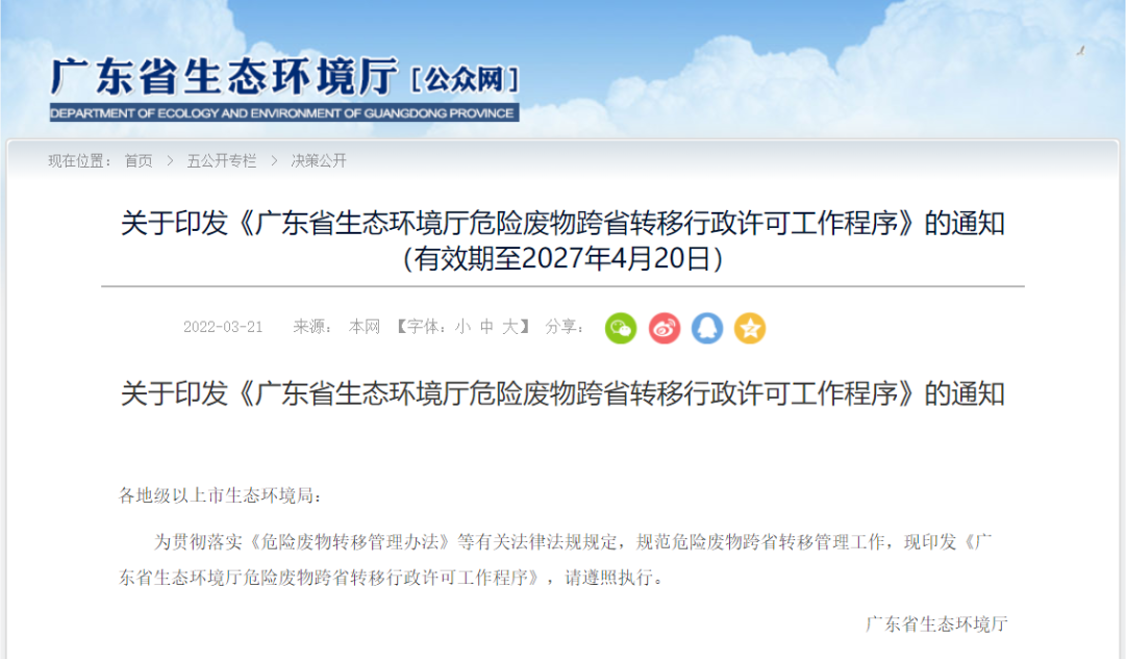 廣東省生態(tài)環(huán)境廳關(guān)于印發(fā)《廣東省生態(tài)環(huán)境廳危險(xiǎn)廢物跨省轉(zhuǎn)移行政許可工作程序》的通知(有效期至2027年4月20日)各地級(jí)以上市生態(tài)環(huán)境局:為貫徹落實(shí)《危險(xiǎn)廢物轉(zhuǎn)...