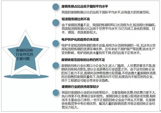 廢鋼鐵回收行業(yè)存在的主要問題有:廢鋼煉鋼占比遠(yuǎn)低于國際平均水平、短流程煉鋼比例不高、電爐轉(zhuǎn)爐化的趨勢仍未改變、廢鋼鐵規(guī)范回收的比例仍然不足、廢鋼鐵行業(yè)的扶持政策較少等問題。
