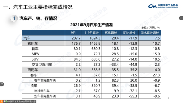 9月,汽車產(chǎn)銷分別達(dá)到207.7萬輛和206.7萬輛,環(huán)比增長(zhǎng)20.4%和14.9%,同比下降17.9%和19.6%。